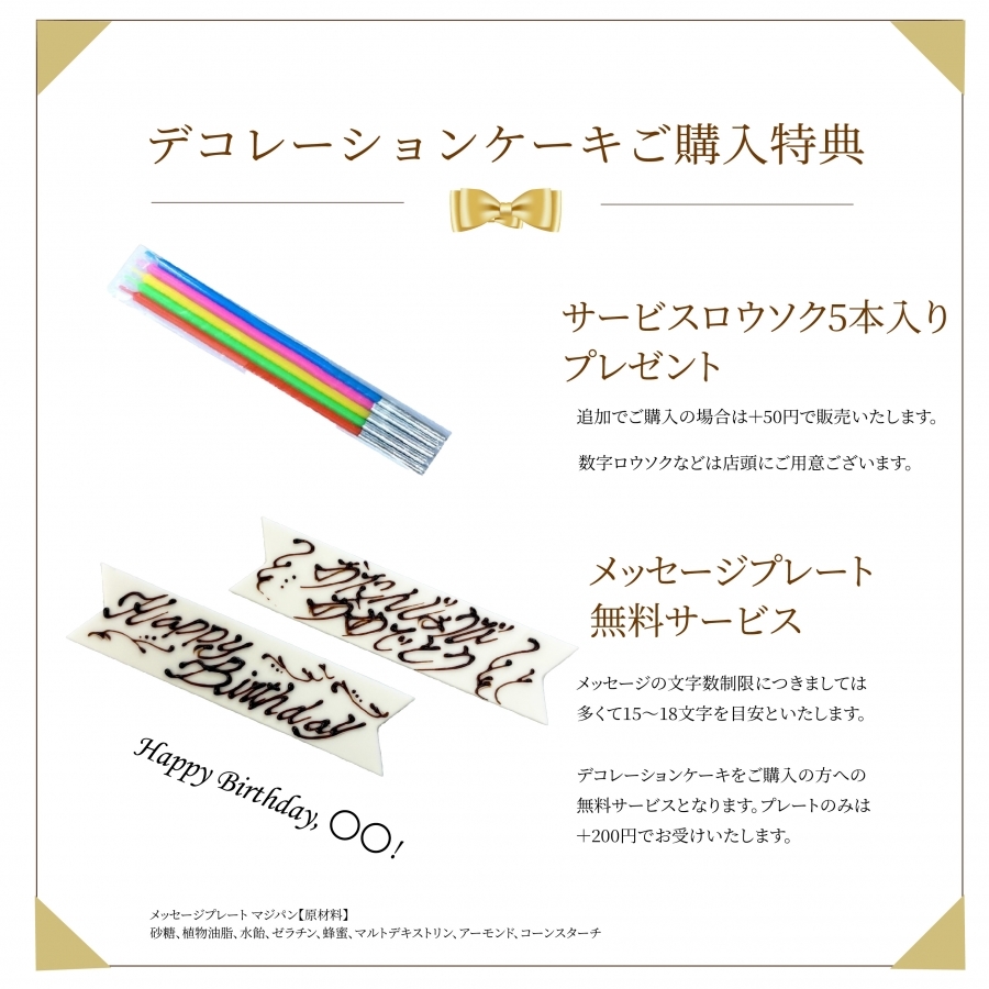 ピクチャープレートやバースディキャンドル(有料)をご希望の方は、商品ページよりご選択ください。